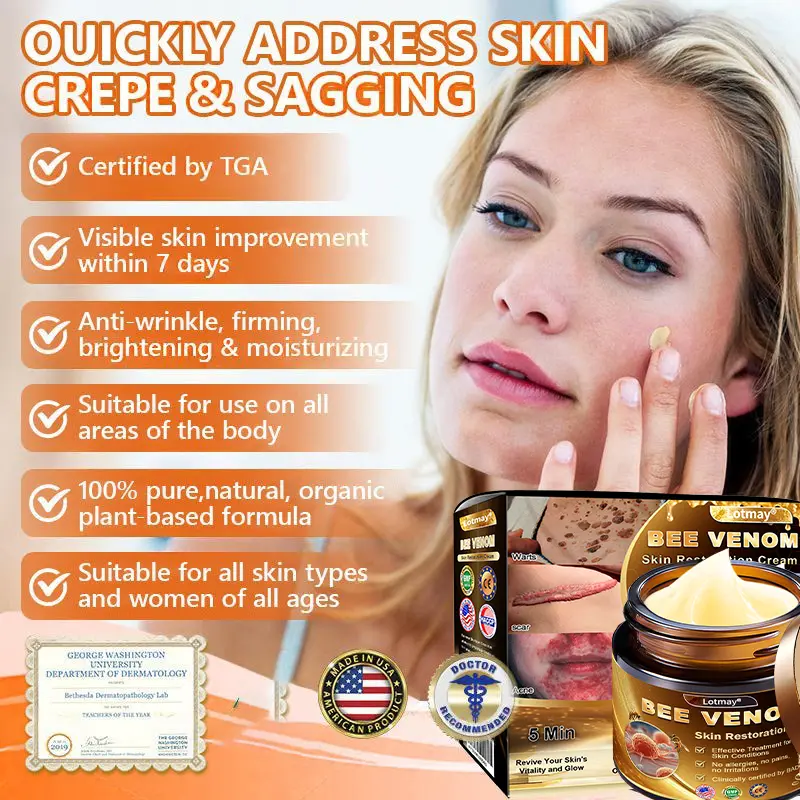 Endorsed by Dr. Sophia L Williams, a board-certified dermatologistย with overย 10 years of expertise in skincare, Lotmayยฎ Bee Venom Skin Restoration Creamย comes highly recommended. This exceptional product provides anย ideal remedy for an array of skin issues, including neck lines, sagging arms, drooping breasts, chest discomfort, stretch marks, cellulite on the abdomen, thighs, and buttocks, as well as sagging buttocks, among others.ย Importantly, it achieves these results without any adverse side effects. Crafted entirely fromย 100% natural plant extracts,ย thisย creamย is suitable for all skin types, including sensitive skin.