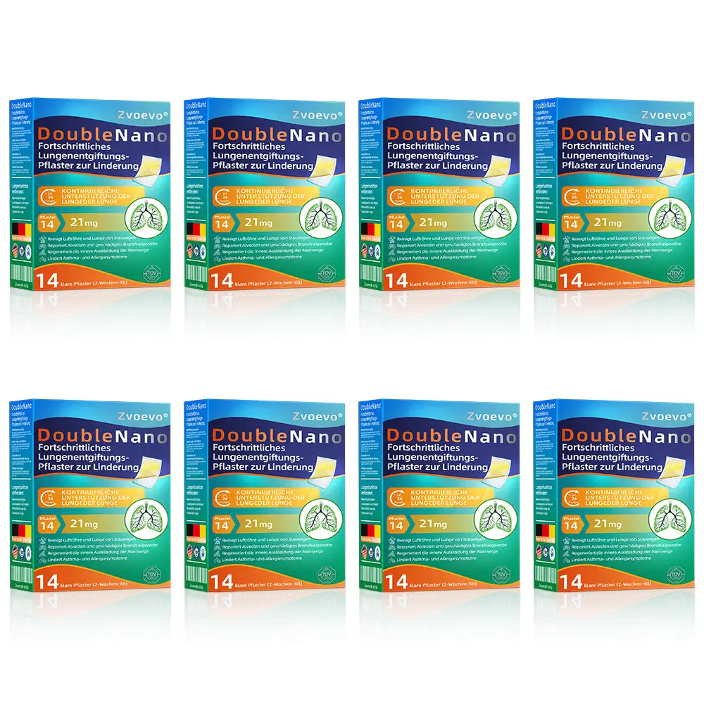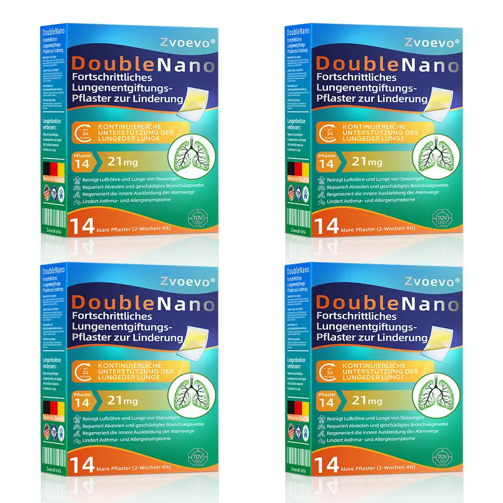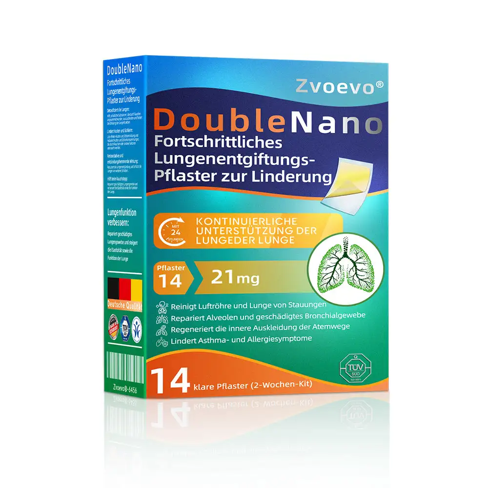 Die einzigartige Doppel-Nano-Formel aus Nano-Quercetin + Resveratrol und Nano-Kollagenpeptiden im Nano-Lungenreinigungspflaster bietet starke antioxidative und immunstรคrkende Vorteile. Diese Wirkstoffe bilden eine Schutzschicht in den Atemwegen und der Lunge und unterstรผtzen die Reparatur geschรคdigter Zellen. Bei regelmรครiger Anwendung stรคrken sie die Widerstandskraft des Atmungssystems, reduzieren die Auswirkungen รคuรerer Krankheitserreger, beugen Atemwegsinfektionen vor und fรถrdern die allgemeine Lungengesundheit.