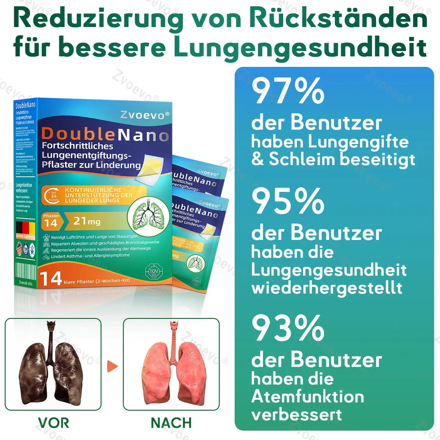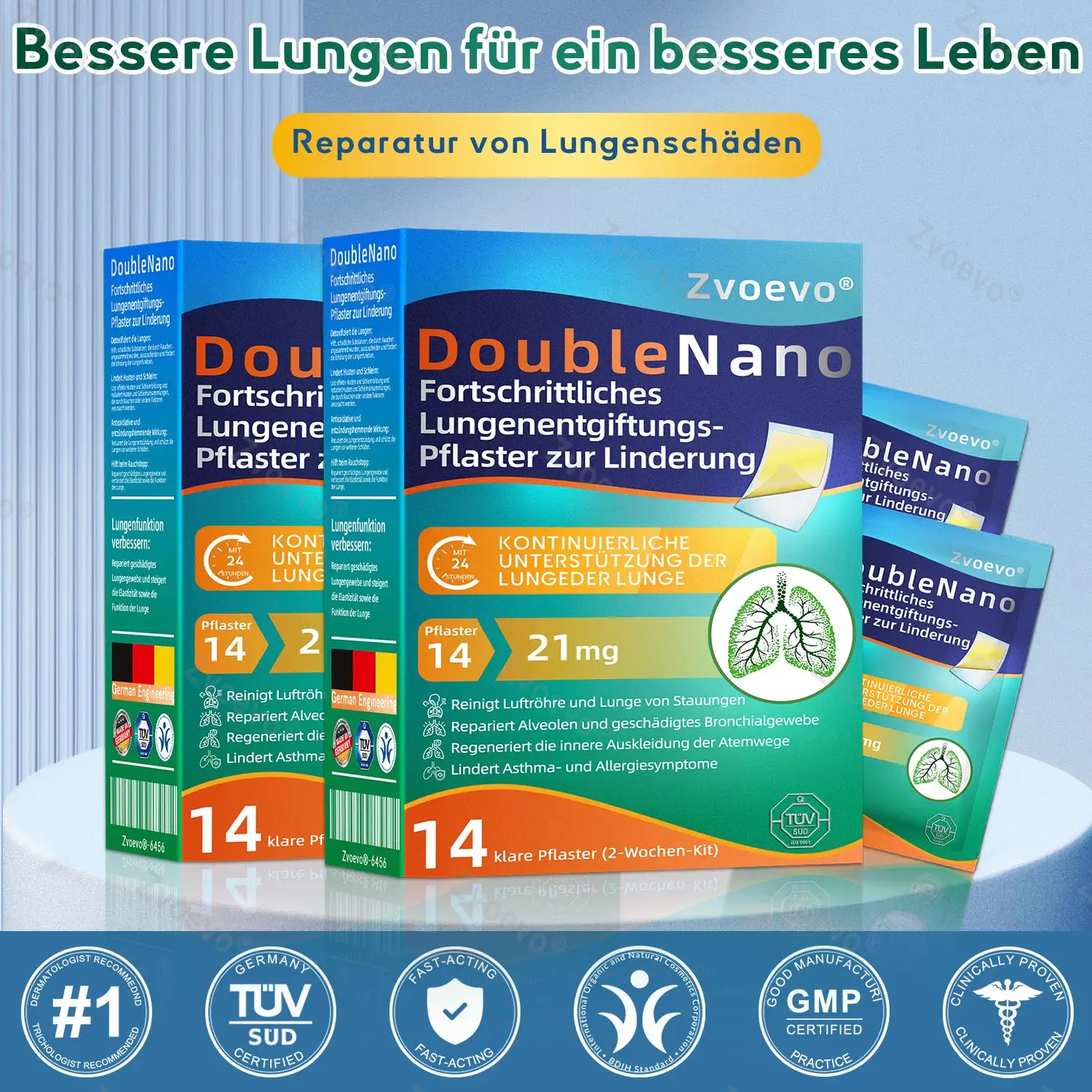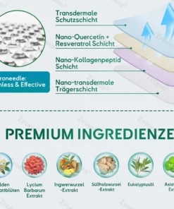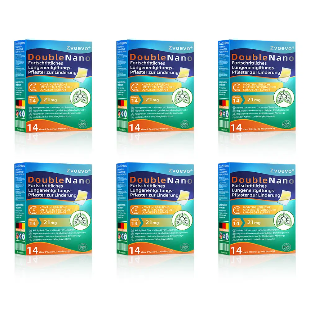 Die einzigartige Doppel-Nano-Formel aus Nano-Quercetin + Resveratrol und Nano-Kollagenpeptiden im Nano-Lungenreinigungspflaster bietet starke antioxidative und immunstรคrkende Vorteile. Diese Wirkstoffe bilden eine Schutzschicht in den Atemwegen und der Lunge und unterstรผtzen die Reparatur geschรคdigter Zellen. Bei regelmรครiger Anwendung stรคrken sie die Widerstandskraft des Atmungssystems, reduzieren die Auswirkungen รคuรerer Krankheitserreger, beugen Atemwegsinfektionen vor und fรถrdern die allgemeine Lungengesundheit.