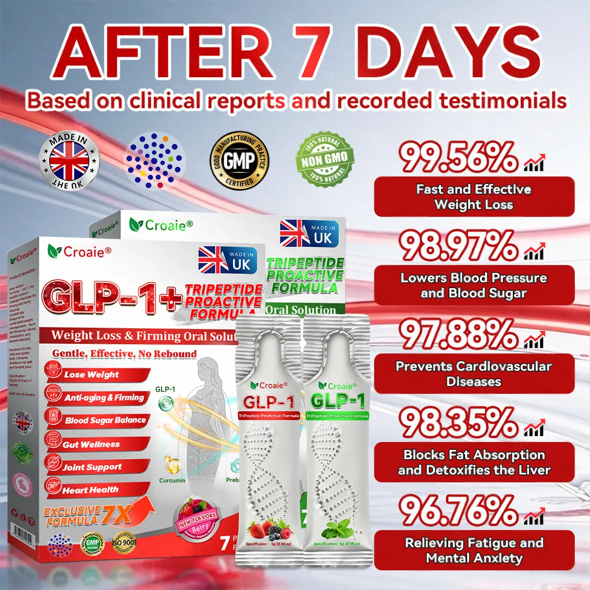 Clinically validated by endocrinologists, CroaieยฎGLP-1 + Collagen Peptides Oral Solution delivers visible improvements in obesity, skin firmness, and overall health within just 7 days.