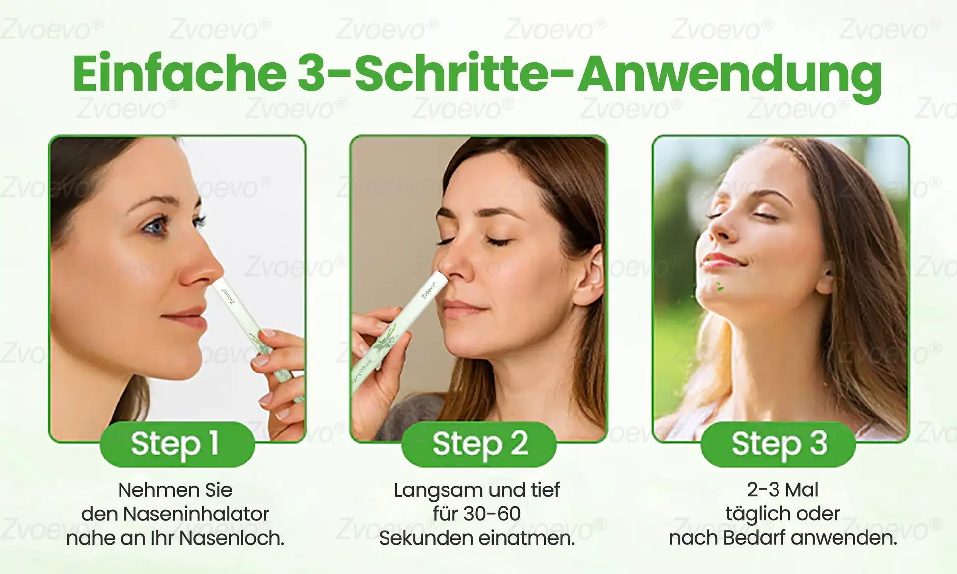 A: Absolut. Zvoevo® verwendet ultrafeines botanisches Pulver mit einer durchschnittlichen Partikelgröße von 5 Mikrometern – entwickelt für eine sanfte, nicht reizende nasale Aufnahme. Die Formel ist frei von synthetischen Chemikalien und aggressiven Inhaltsstoffen, wodurch sie sanft zu den Nasengängen ist und sich für die langfristige Anwendung eignet. Sie trocknet die Nase nicht aus und verursacht keine Rebound-Effekte wie viele pharmazeutische Sprays.