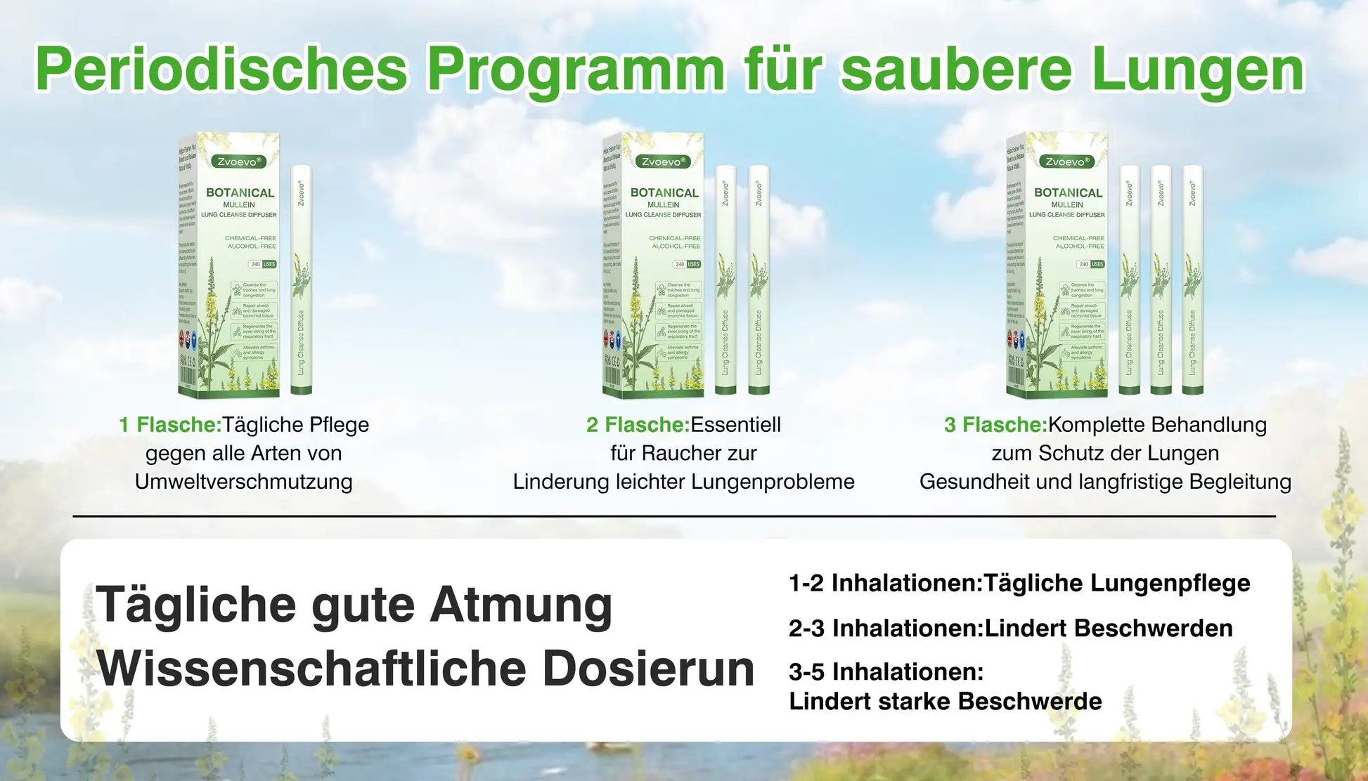 Im Gegensatz zu herkömmlichen Nahrungsergänzungsmitteln, die Stunden benötigen, um zu wirken, bietet der Zvoevo® Botanischer Mullein Lungenreinigungsdiffusor einen klaren Zeitplan für spürbaren Komfort. Innerhalb von 2 Minuten werden Sie eine deutliche beruhigende Linderung spüren, wenn der Mullein-Extrakt direkt mit Ihrem Atemwegsgewebe in Kontakt kommt. Nach 2 Wochen konsequenter Anwendung beginnen anhaltender Husten und Engegefühl in der Brust merklich nachzulassen. Nach 4 Wochen werden Sie eine nachhaltige Verbesserung des Atemkomforts erleben – wieder frei atmen. Diese fortschreitende Unterstützung arbeitet mit den natürlichen Prozessen Ihres Körpers für langfristiges Wohlbefinden, nicht nur für eine vorübergehende Linderung.