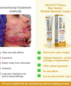 NEGUSY® Botox Bee Venom Wrinkle Removal Cream uses high-quality ingredients to maximize efficacy by locking in moisture, stimulating collagen production, smoothing wrinkles, and repairing damage.