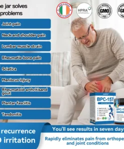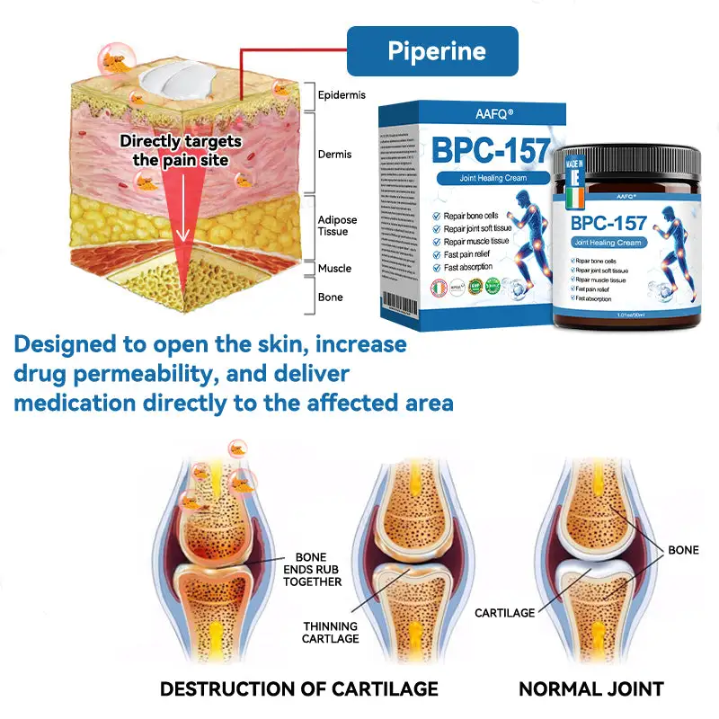 AAFQ® BPC-157 Joint Healing Cream provides fast pain relief and safely and effectively resolves up to 99% of symptoms of orthopedic problems such as osteoarthritis. rheumatoid arthritis. bursitis. tendinitis and osteoporosis in 2 weeks. helping achieve full recovery.No matter the type of arthritis you have—whether it’s osteoarthritis. rheumatoid arthritis. bursitis. tendinitis. osteoporosis. gout. carpal tunnel syndrome. ligament sprains and strains. bunion deformities. or tennis elbow—our product is formulated to treat and alleviate the pain associated with all these conditions.