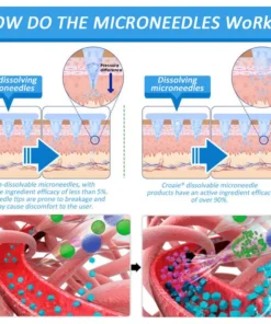Cada aguja mide 0,27 mm de largo, apenas 1/7 del grosor de un cabello, y está hecha de medicamento soluble. Estas microagujas están diseñadas con precisión mediante técnicas de fabricación de vanguardia para garantizar una experiencia fluida e indolora, a la vez que administran eficazmente los ingredientes activos directamente en la piel.