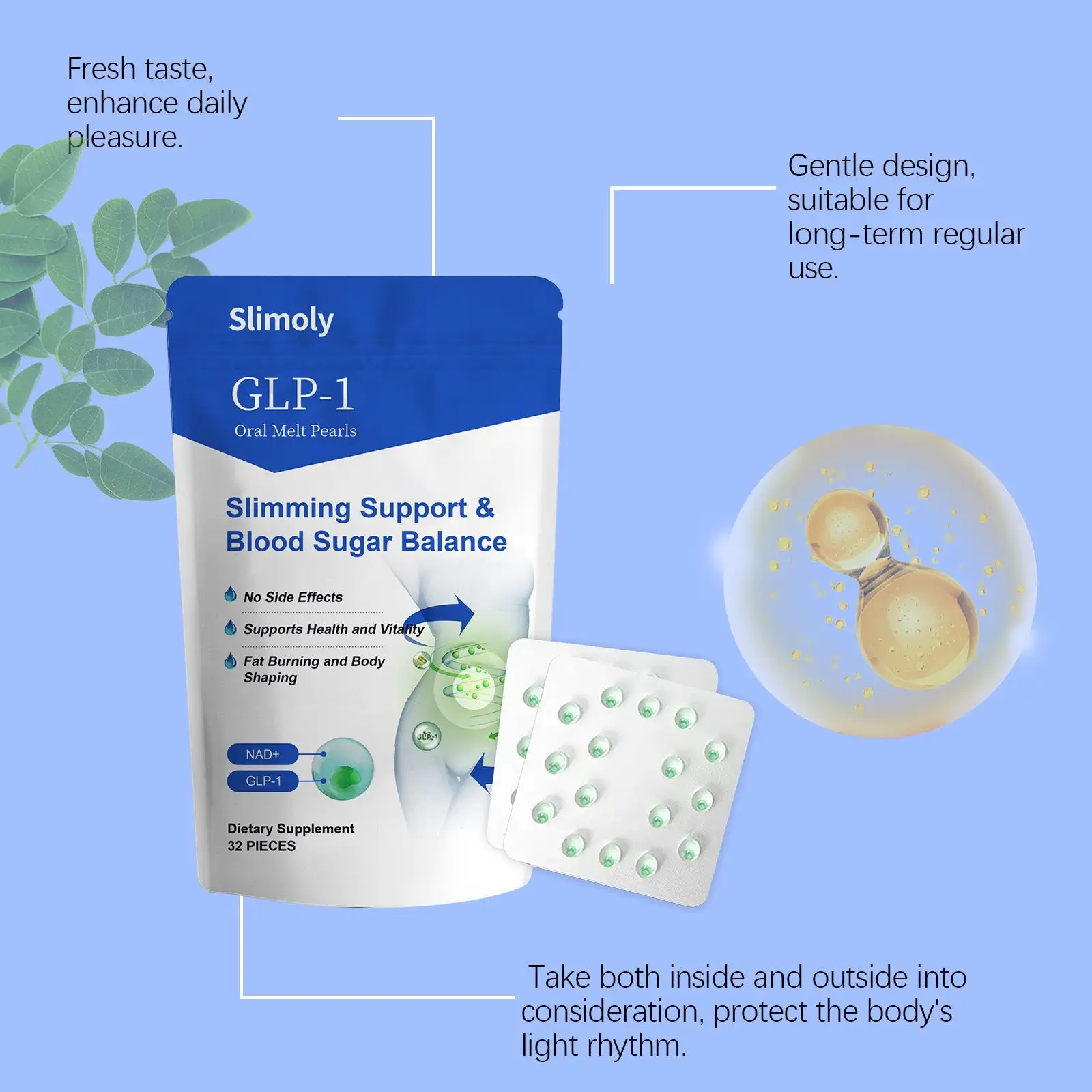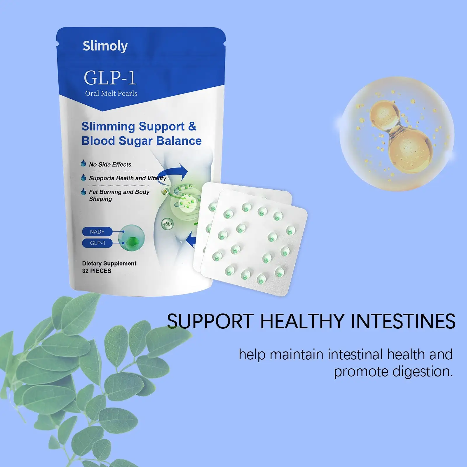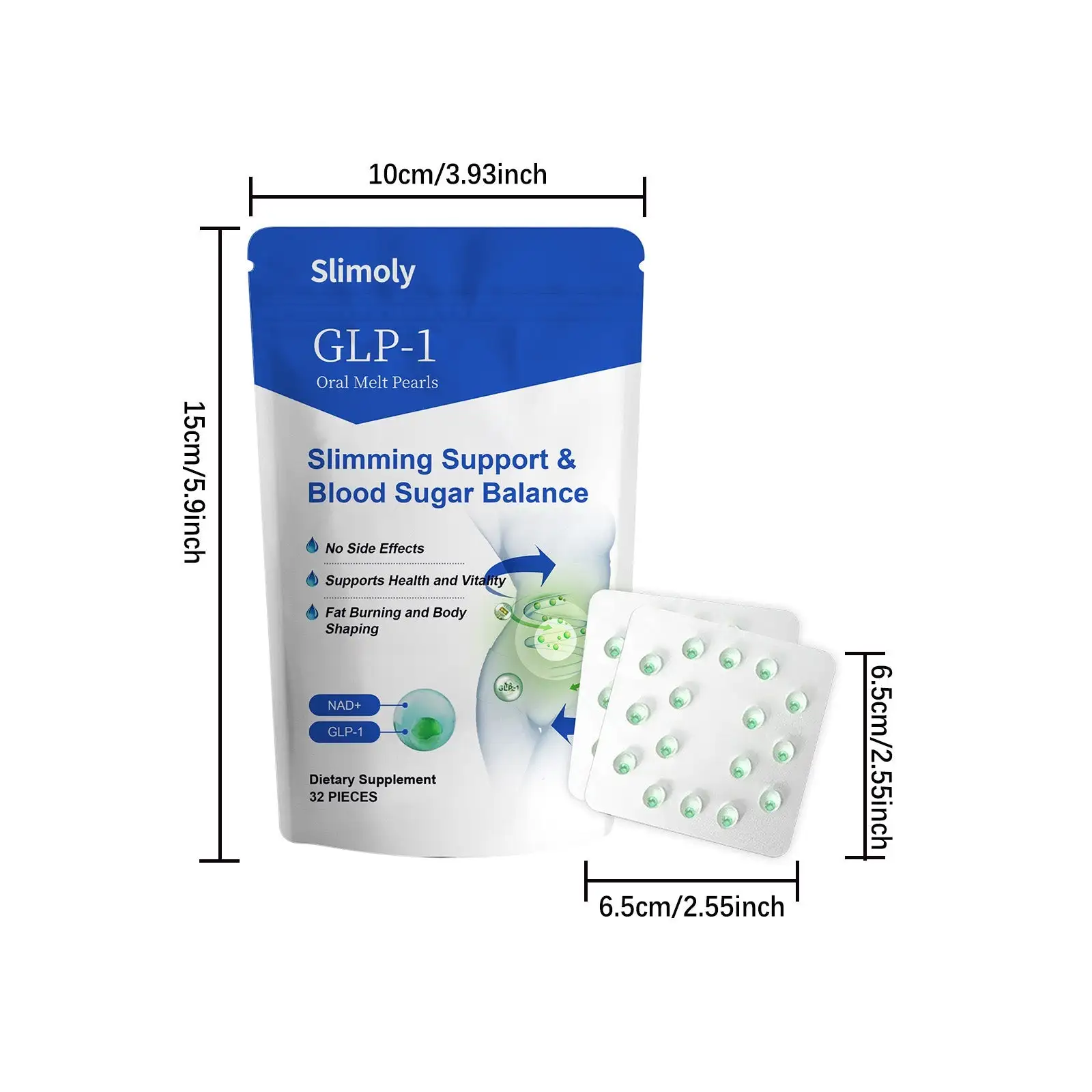 - 1× Resealable Pouch – 32 Slimoly™ Oral Melt Pearls (30-Day Supply)
