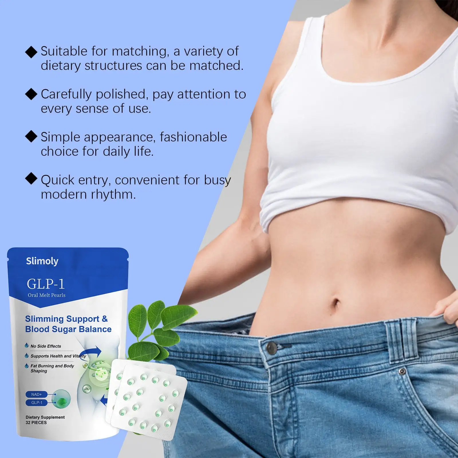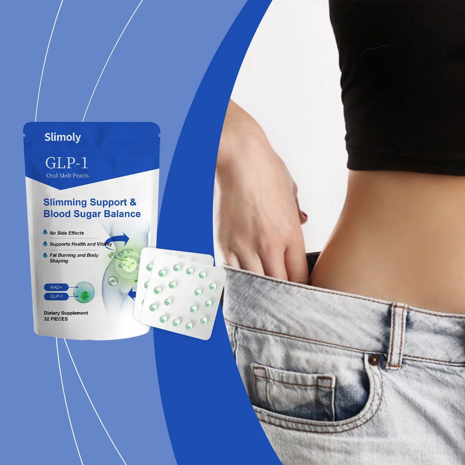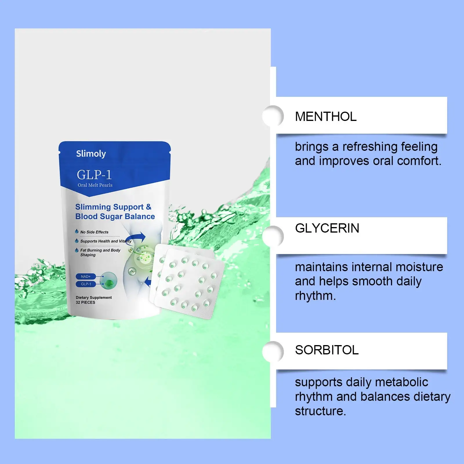 - 1× Resealable Pouch – 32 Slimoly™ Oral Melt Pearls (30-Day Supply)