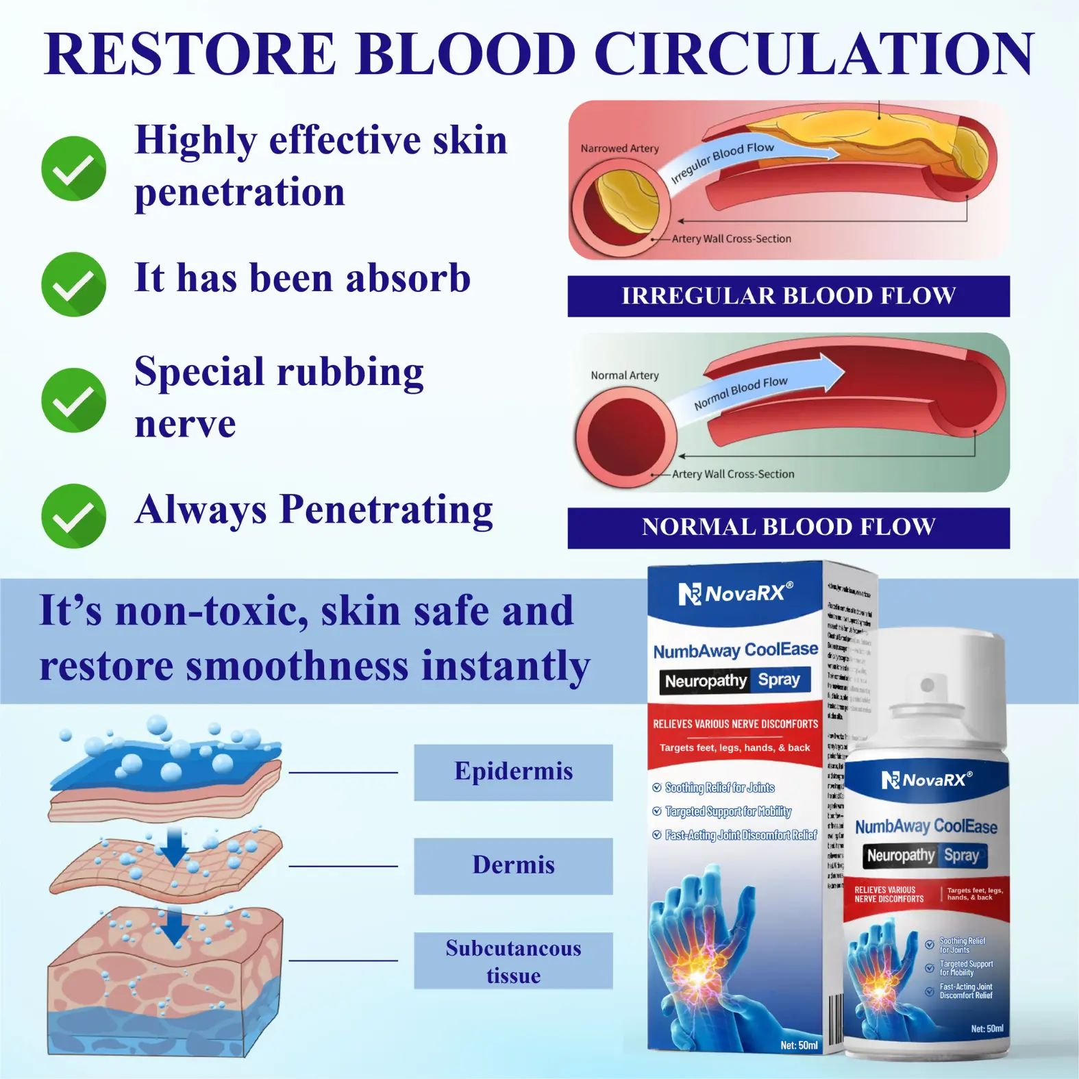 NovaRX® NumbAway CoolEase Neuropathy Spray is infused with a powerful blend of clinically trusted ingredients that work together to soothe irritated nerves, block pain signals, and support long-term nerve health.